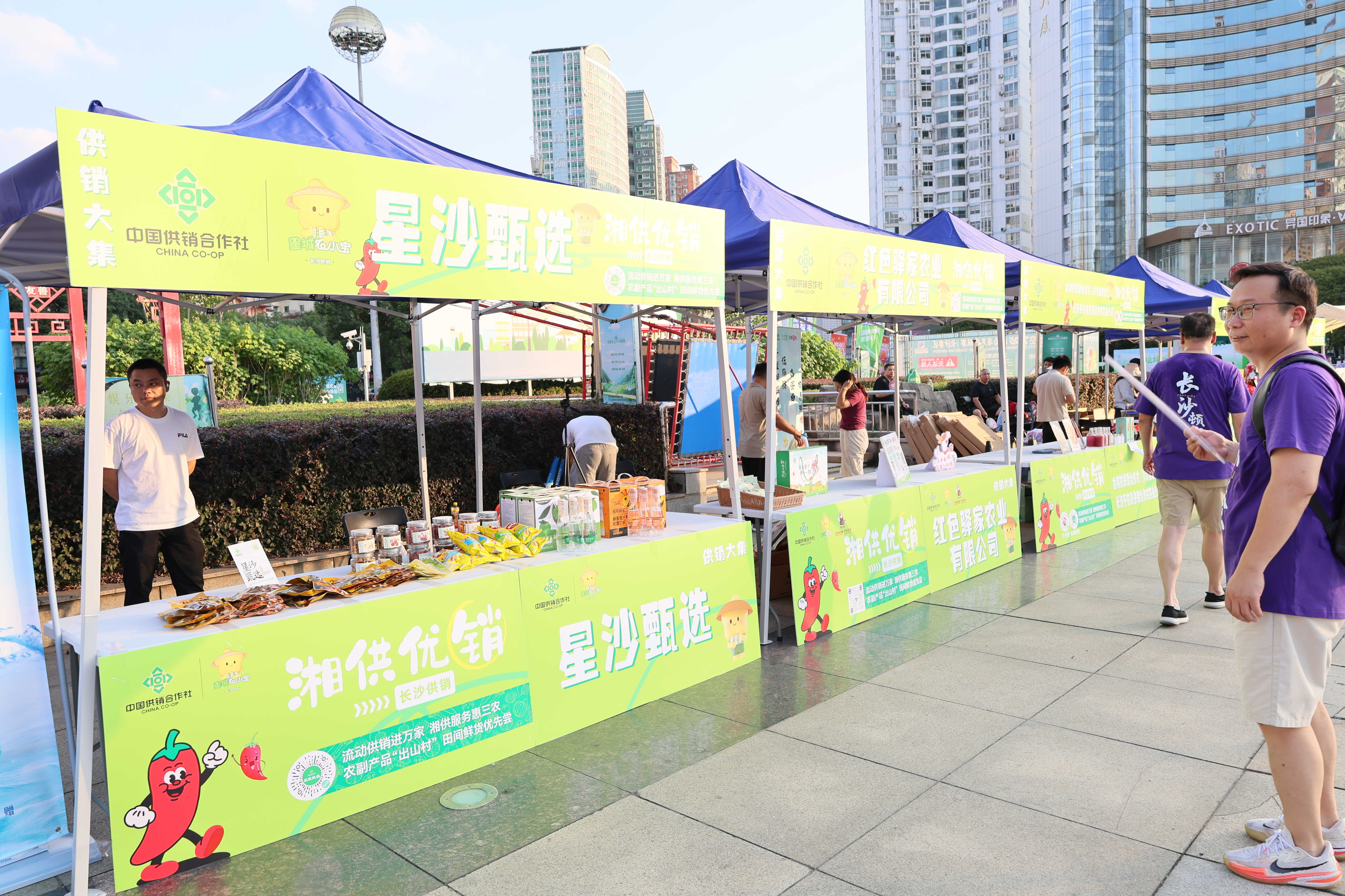 在賀龍體育場東廣場,供銷大集為前來觀賽的球迷朋友們,提供了一個精致的“湖湘風味體驗館”:望城鲌魚、靖港香干、橋驛銅鵝、糯米酒、搖搖蜂蜜水等長沙本地農特產品悉數“上場”。市民王女士邊選購邊感嘆:“看球賽還能品嘗長沙風味,體驗更豐富了!”