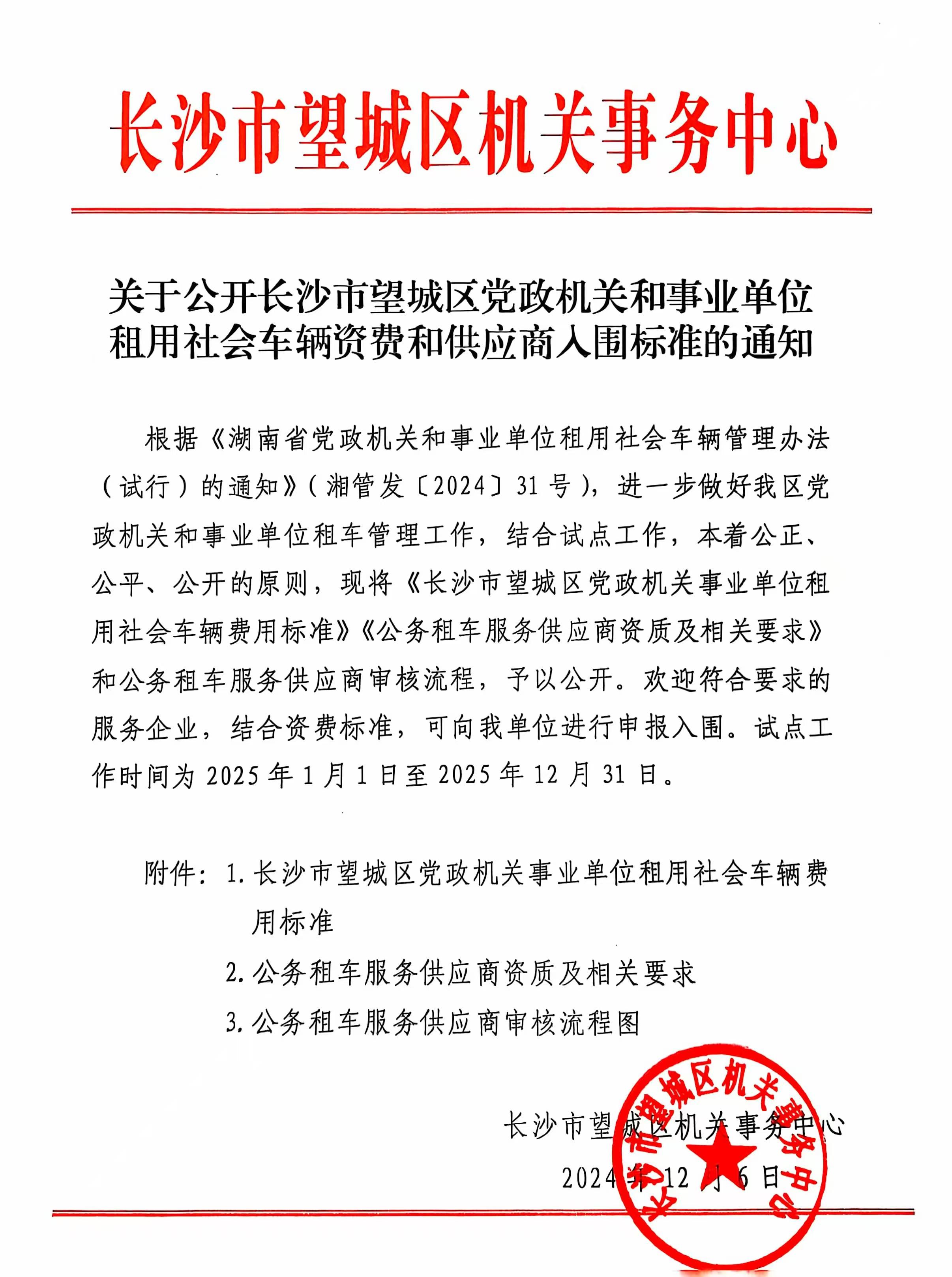 關于公開長沙市望城區黨政機關和事業單位租用社會車輛資費和供應商入圍標準的通知