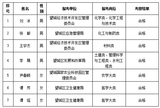根據《“智匯瀟湘?才聚望城”長沙市望城區2023年事業引才博士公開引進簡章》和《關于長沙市望城區2023年事業引才博士公開引進工作考核有關事項的通知》的要求,我區2023事業引才博士公開引進的報名、資格初審、考核、體檢、考察等工作已經結束。現將考察合格人員名單公示如下: