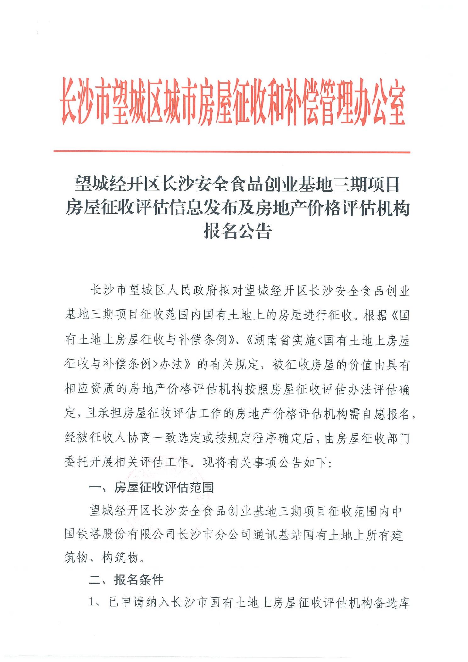 望城經開區長沙安全食品創業基地三期項目房屋征收評估信息發布及房地產價格評估機構報名公告