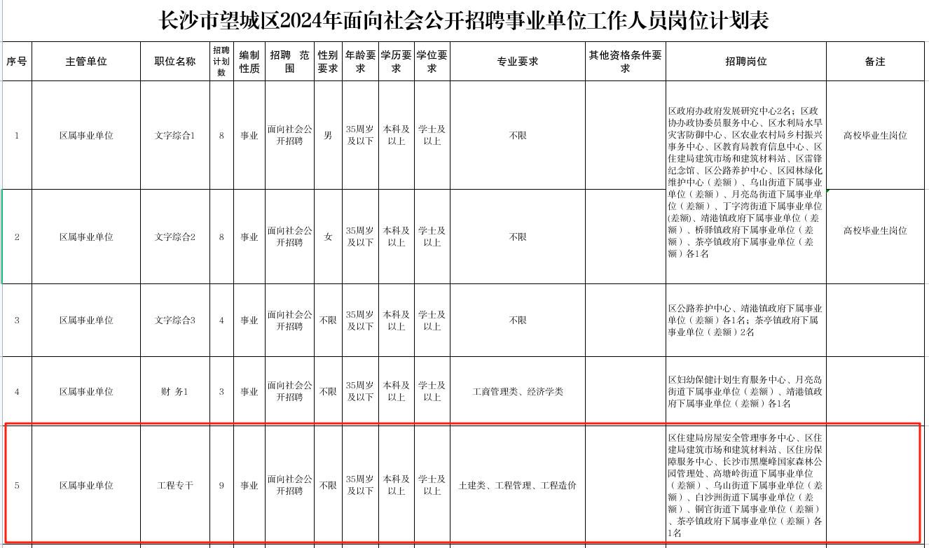 1.招聘單位、崗位、計劃數、具體資格條件見《長沙市望城區2024年面向社會公開招聘事業單位工作人員崗位計劃表》(附件1)。