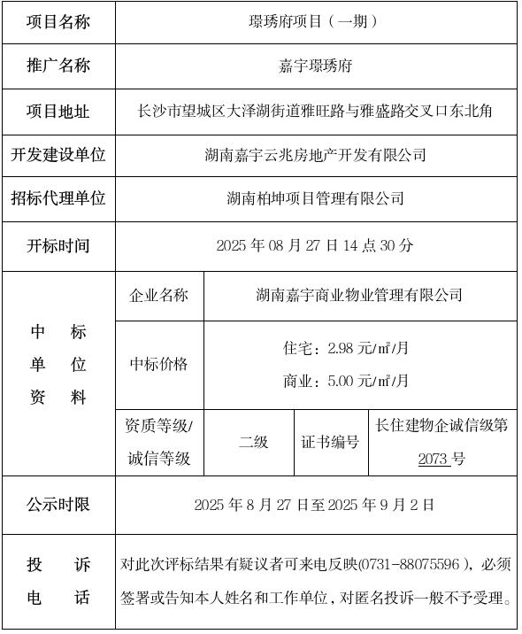 璟琇府項目(一期)前期物業管理招投標評標結果公示