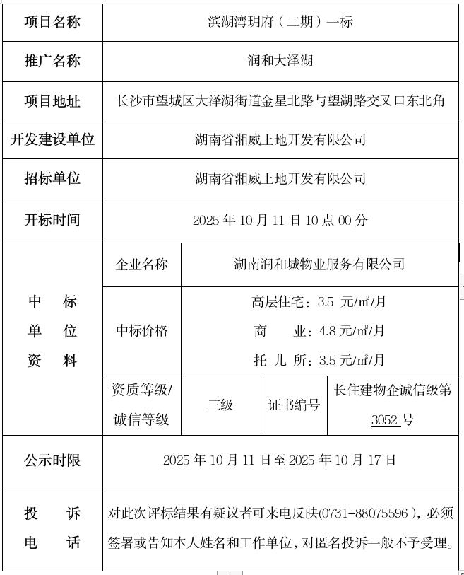 濱湖灣玥府(二期)一標(biāo)前期物業(yè)管理招投標(biāo)評標(biāo)結(jié)果公示