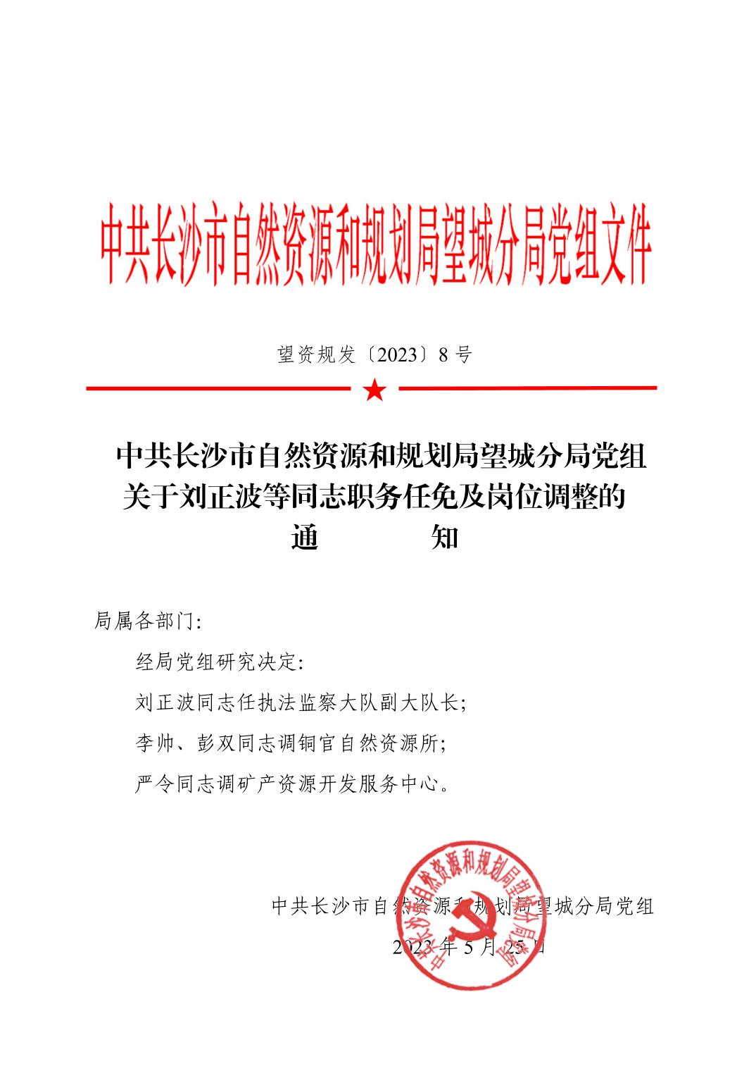 中共長沙市自然資源和規劃局望城分局黨組關于劉正波等同志職務任免及崗位調整的通知