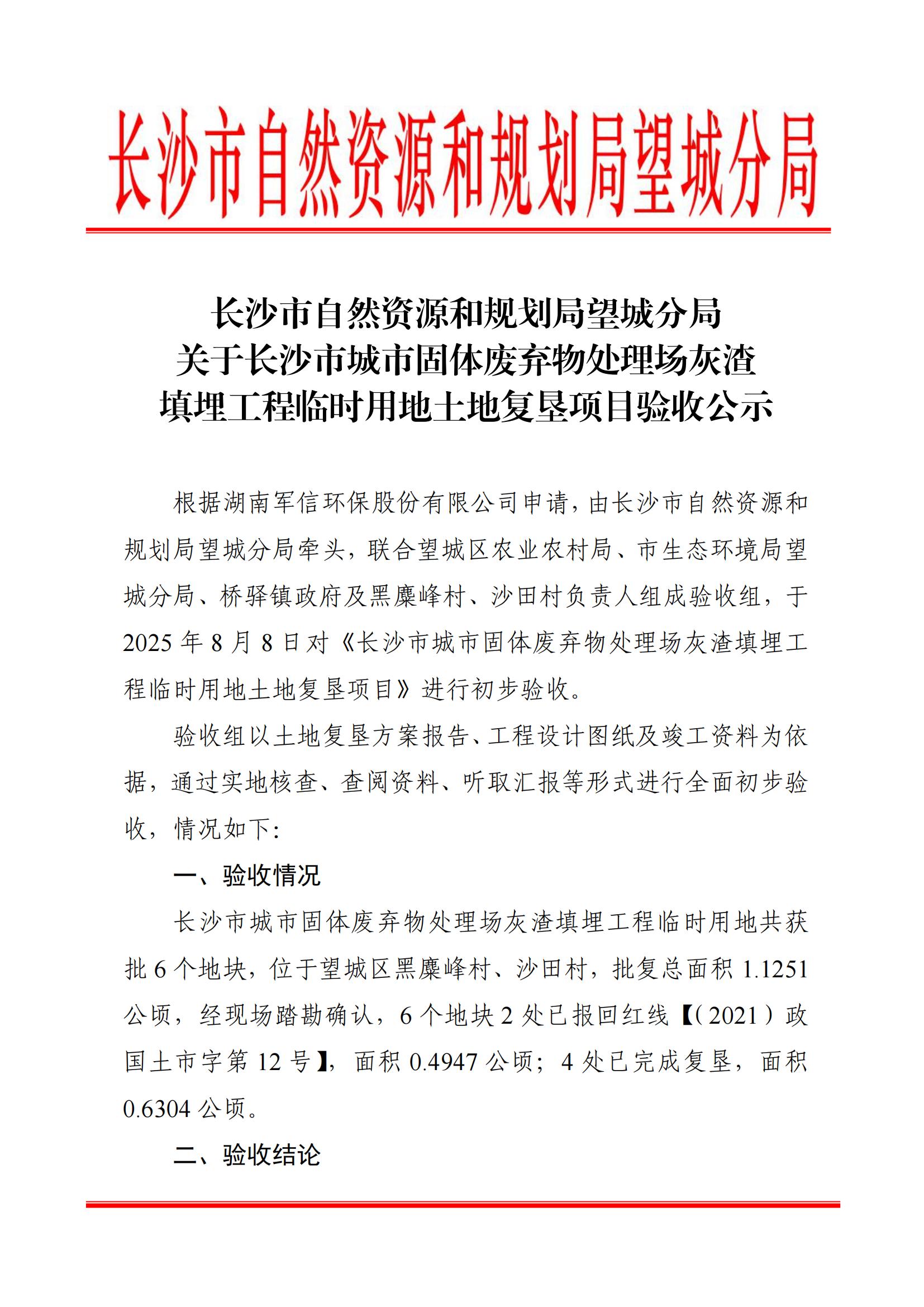 關于長沙市城市固體廢棄物處理場灰渣 填埋工程臨時用地土地復墾項目驗收公示
