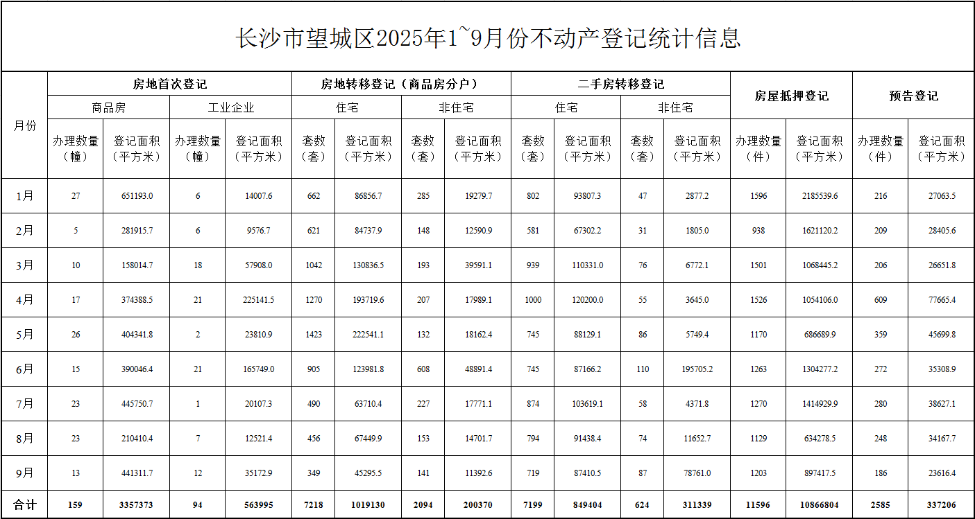 2025年1~9月份長沙市望城區不動產登記中心業務辦理情況公示