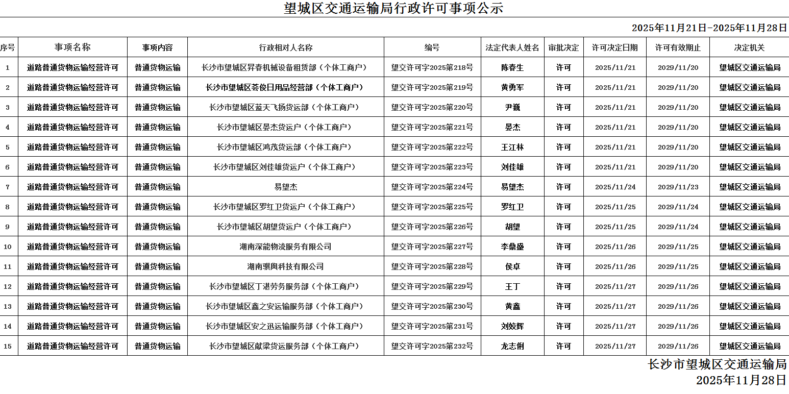 望城區交通運輸局行政許可事項公示(2025年11月21日-11月28日)