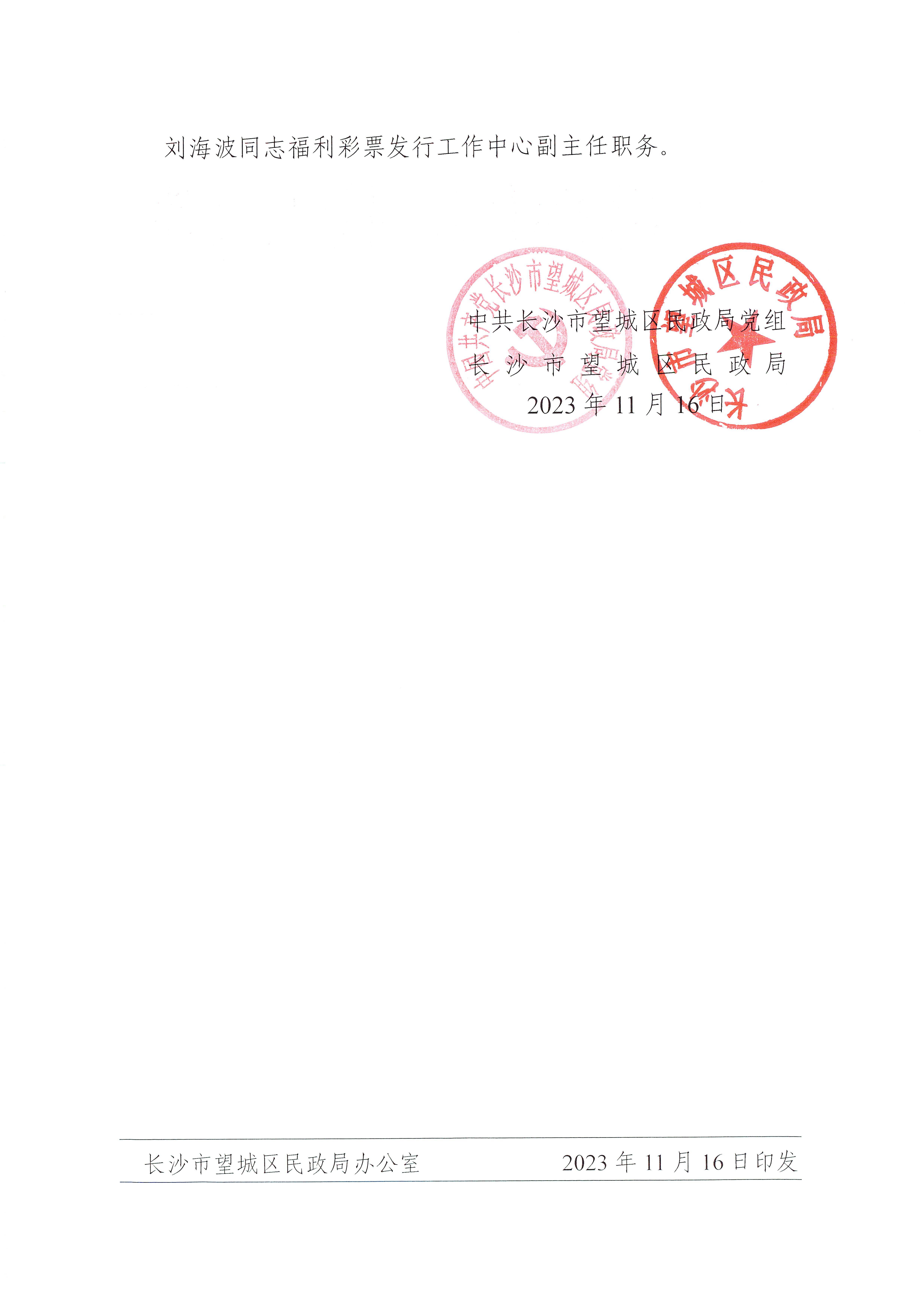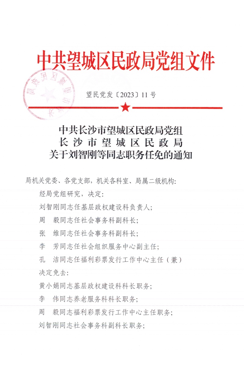 中共長沙市望城區民政局黨組長沙市望城區民政局關于劉智剛等同志職務任免的通知