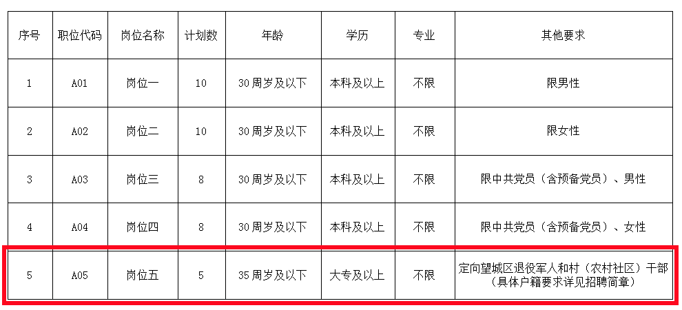 2.戶籍要求(需滿足下列條件之一):①具有望城區戶籍的(不含被托管的街鎮,下同;落戶時間截止至2024年5月6日)。②持有有效望城區居住證的(簽發日期為2023年5月6日至2024年5月6日)。③原望城區戶籍,因考入大專及大專以上學校,戶口遷入所在學校集體戶口,畢業后未遷回的。④本人、配偶或父母在望城區擁有住房的(購房網簽合同簽訂時間截止至2024年5月6日)。⑤報考A05崗位的退役軍人要求具有望城區戶籍或入伍前戶籍為原望城區戶籍,村(農村社區)干部要求具有望城區戶籍。
