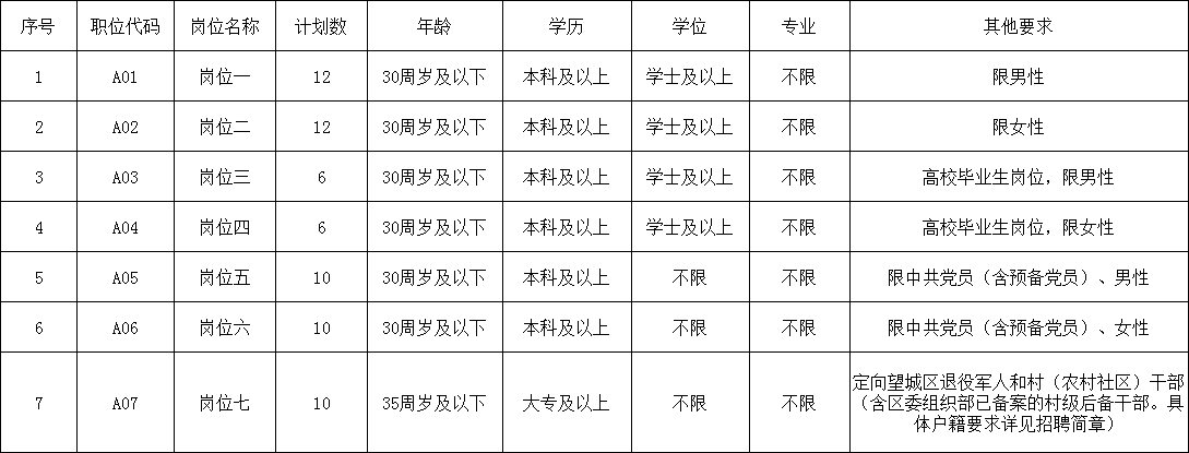 招聘社區專職工作人員66名,共分7類崗位,詳見附件《長沙市望城區2025年公開招聘社區專職工作人員崗位信息表》。