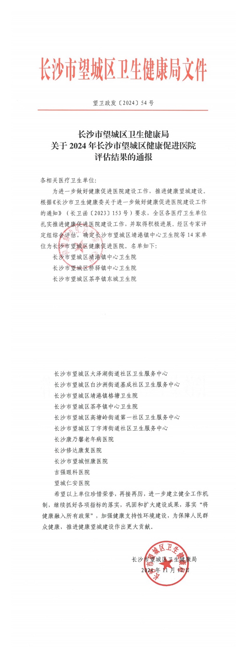 長沙市望城區衛生健康局關于2024年長沙市望城區健康促進醫院評估結果的通報