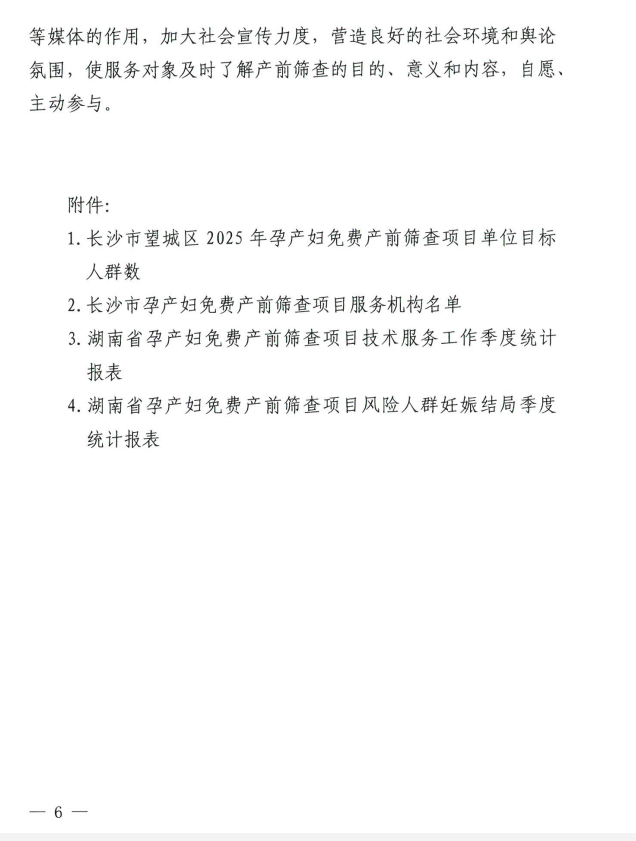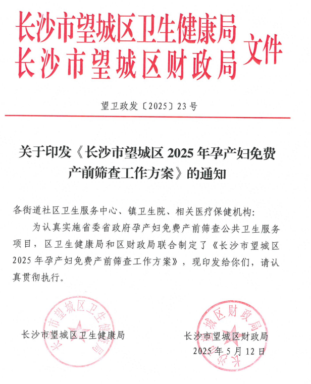 關于印發《長沙市望城區2025年孕產婦免費產前篩查工作方案》的通知