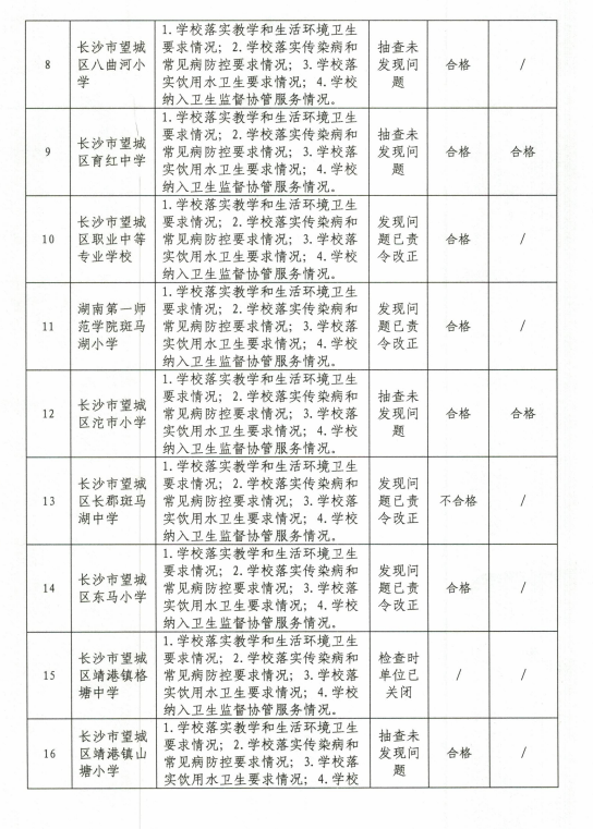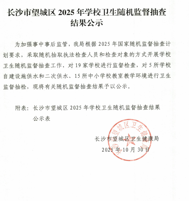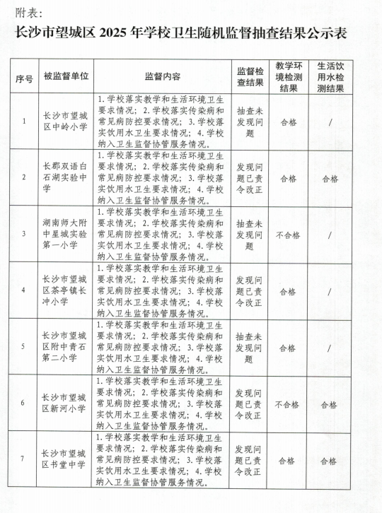 長沙市望城區2025年學校衛生隨機監督抽查結果公示