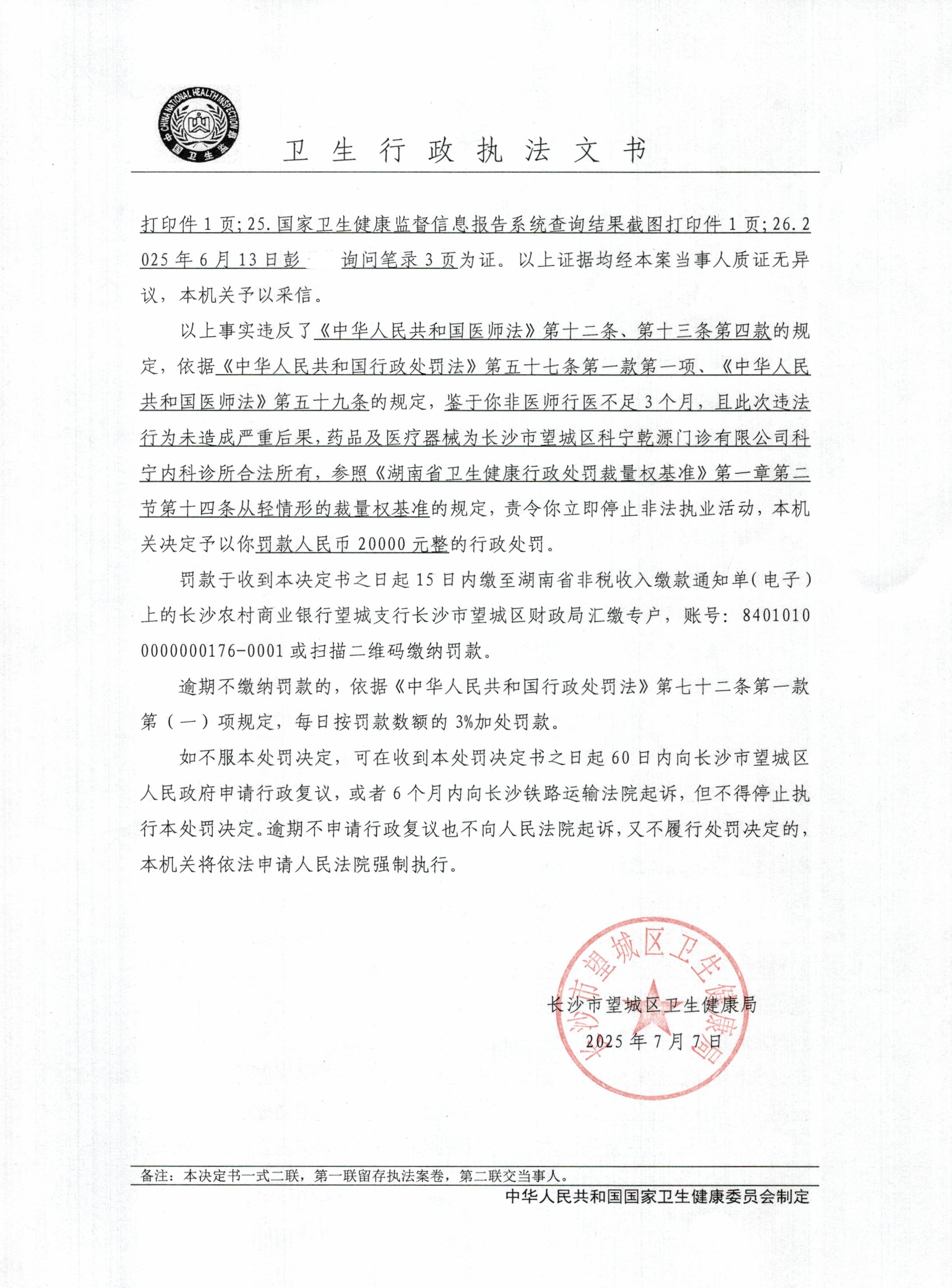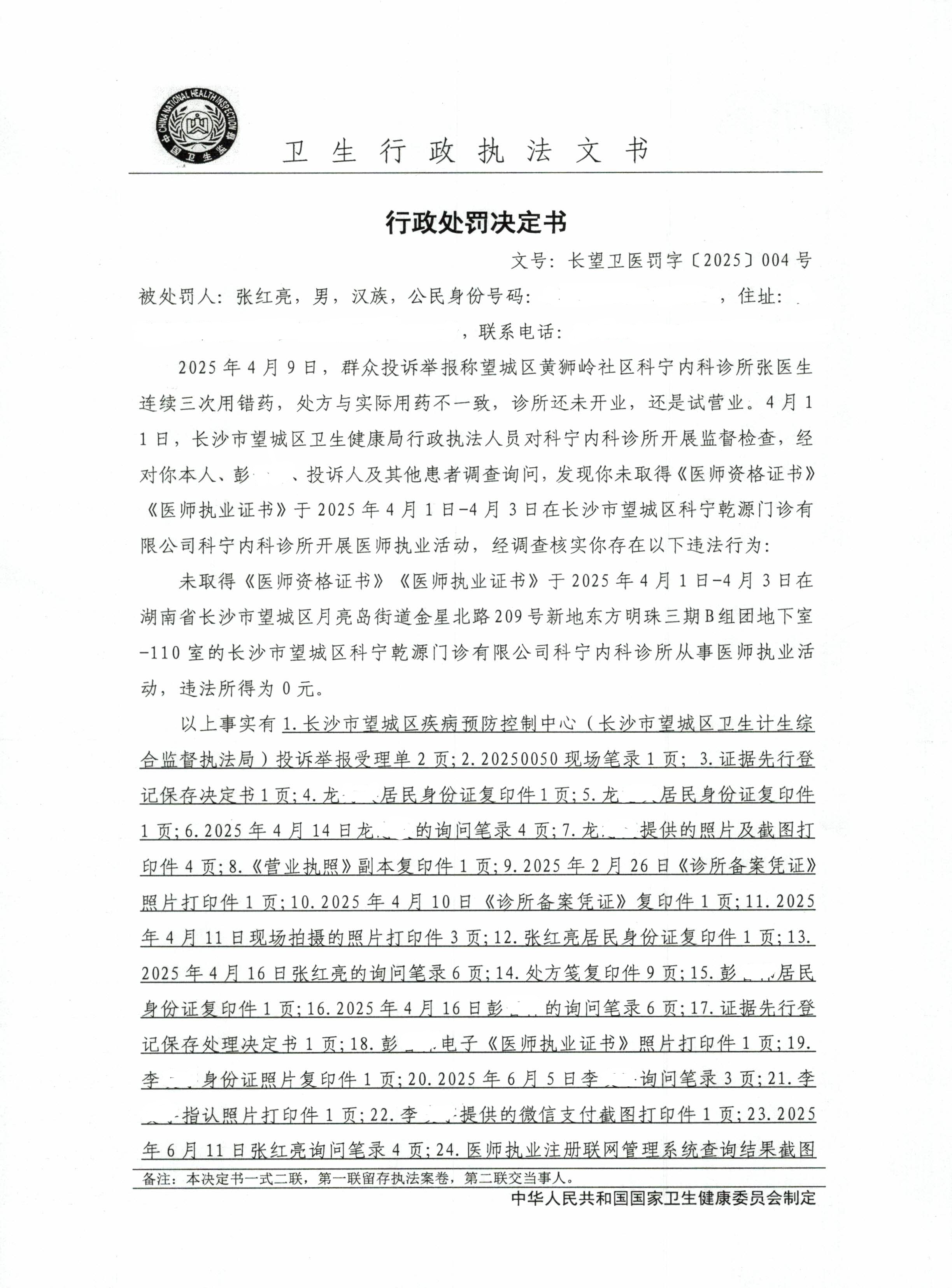 長沙市望城區衛生健康局關于對張紅亮的行政處罰決定書