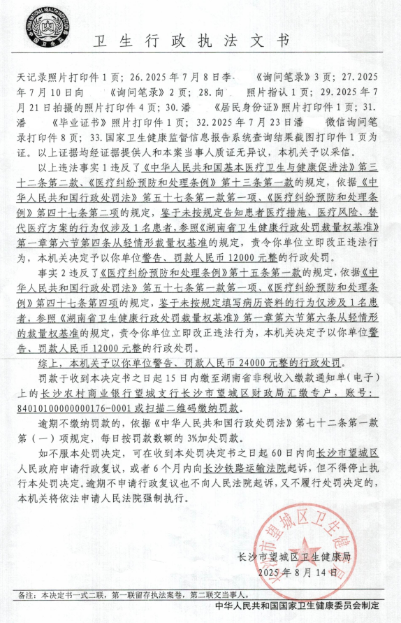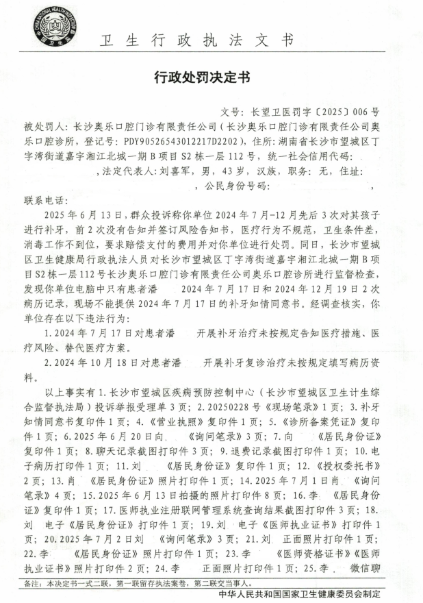 長沙市望城區衛生健康局關于對奧樂口腔的行政處罰決定書