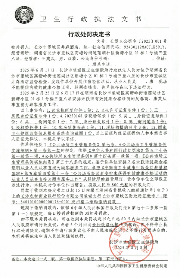 長沙市望城區(qū)衛(wèi)生健康局關(guān)于對井森酒店的行政處罰決定書