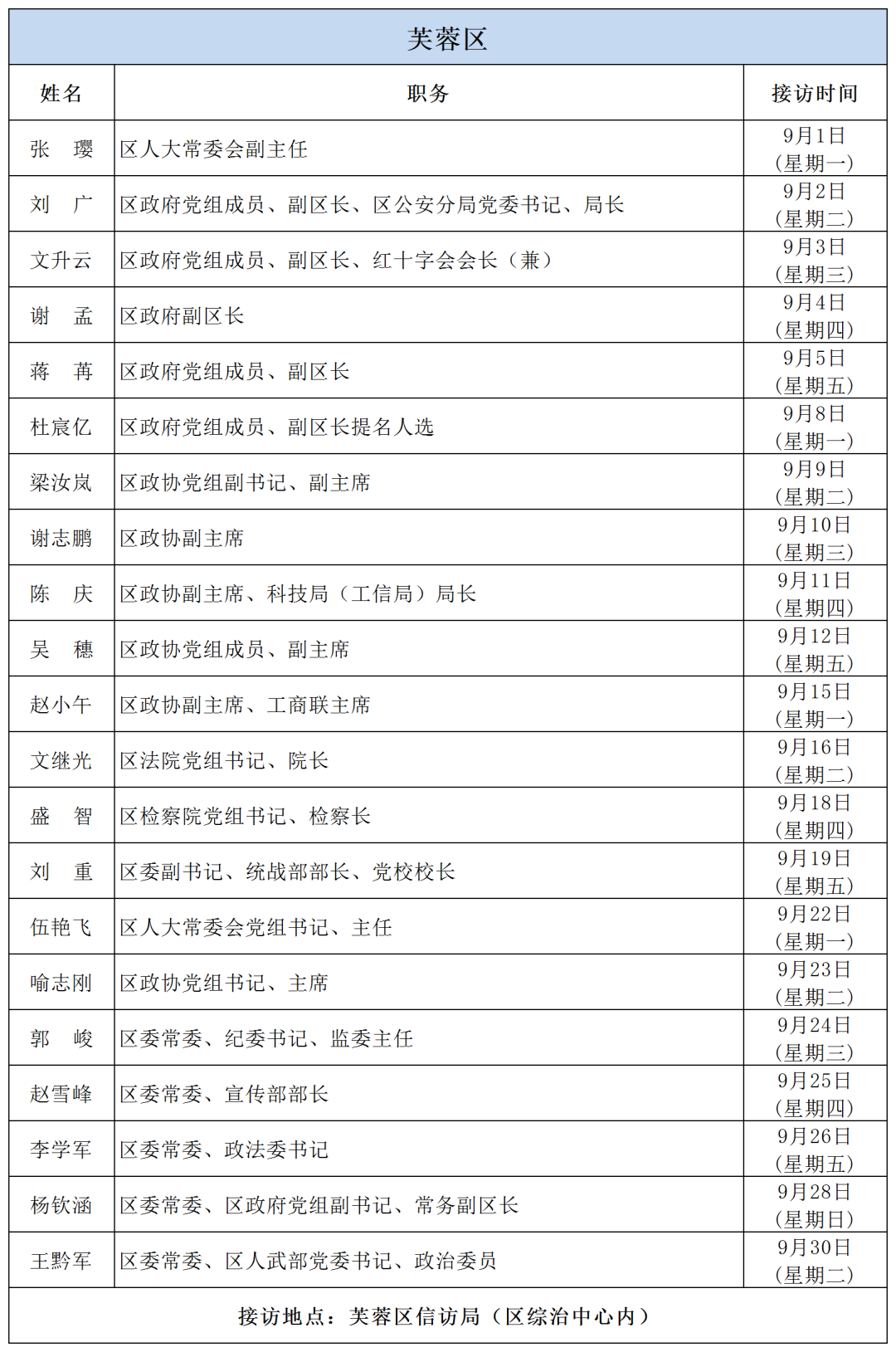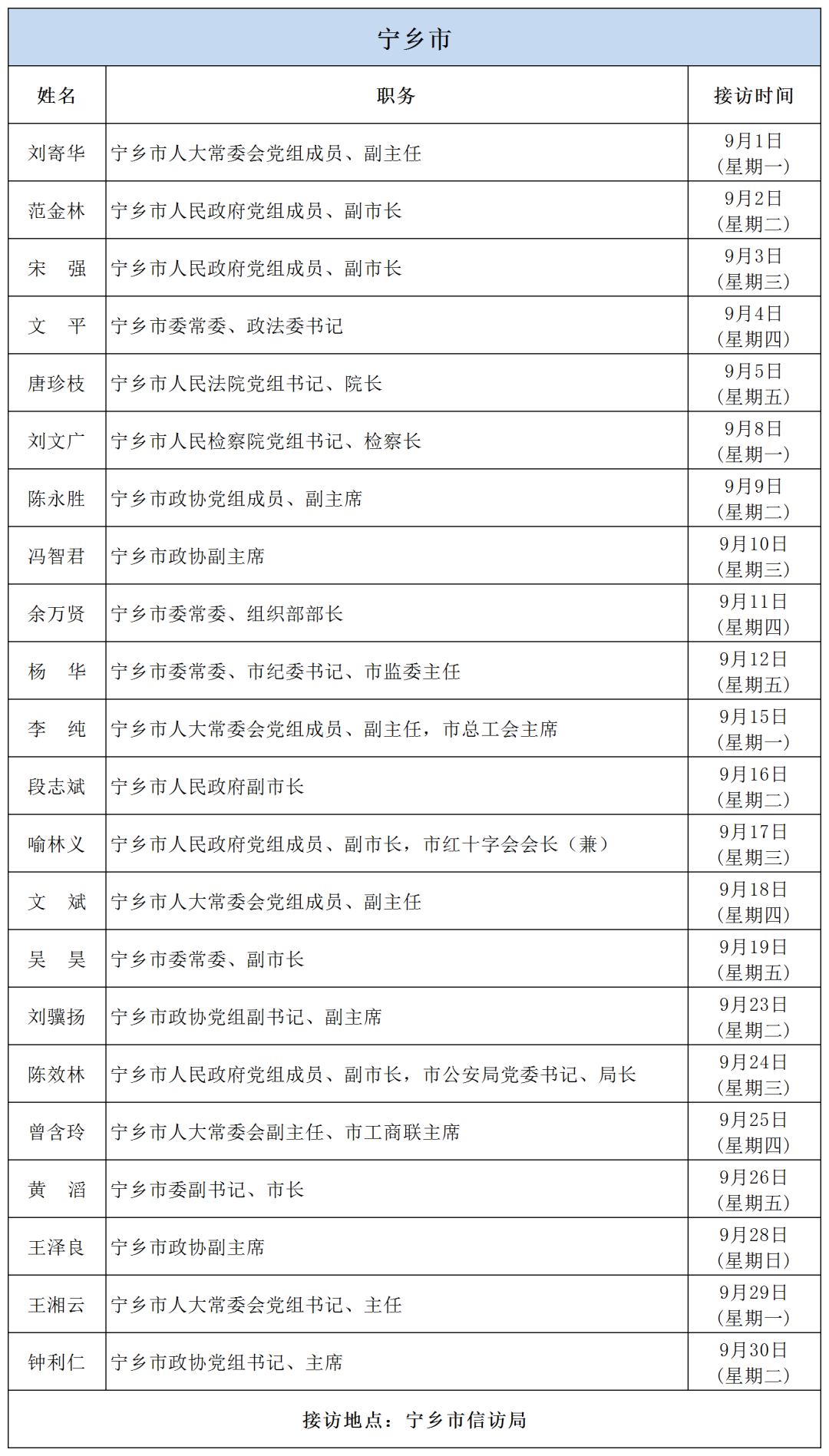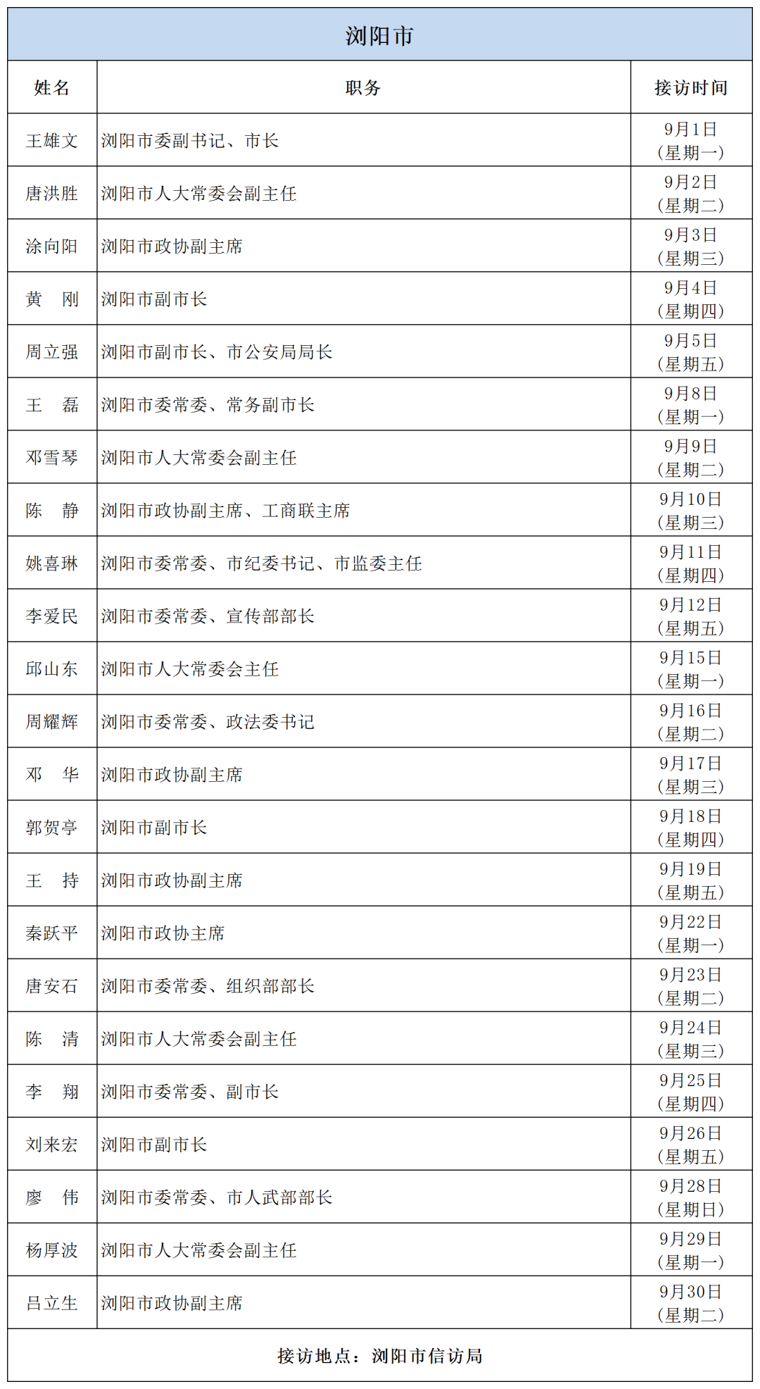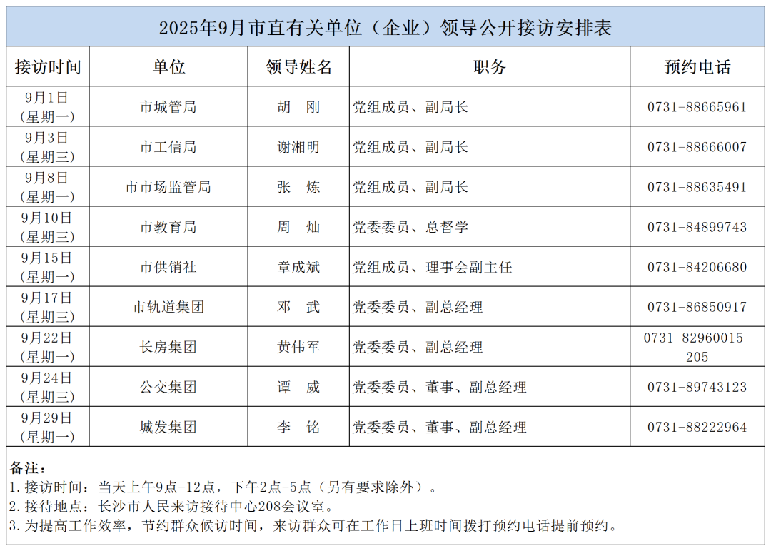 公告 | 2025年9月份湖南湘江新區、各區縣(市)及相關市直單位(企業)領導接訪安排