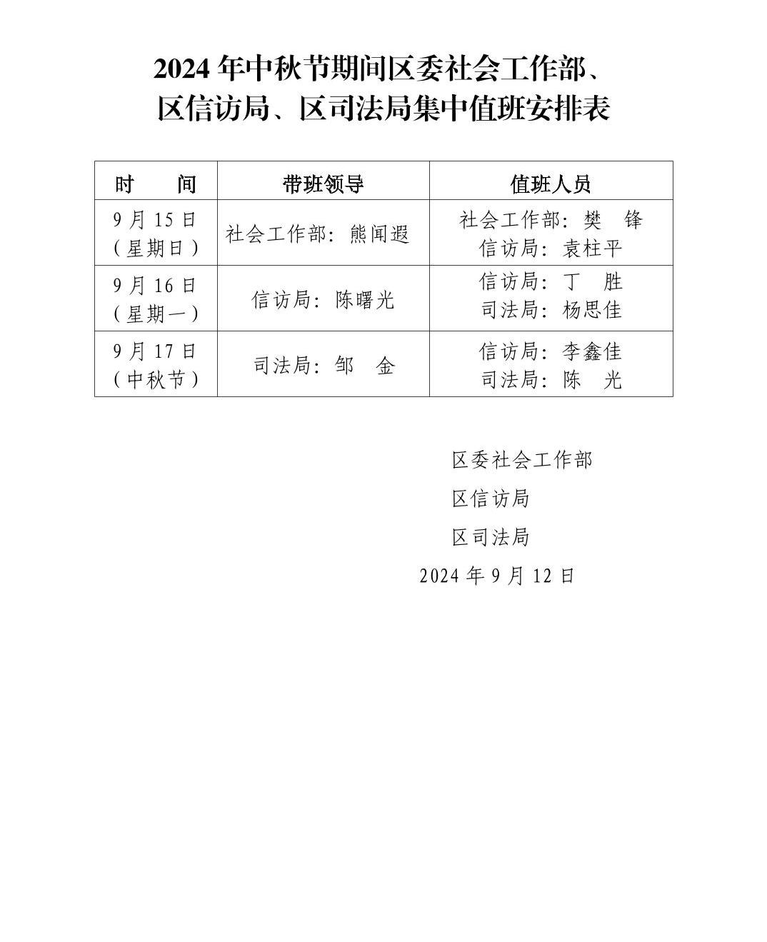 2024年中秋節(jié)期間區(qū)委社會(huì)工作部、區(qū)信訪局、區(qū)司法局集中值班安排表