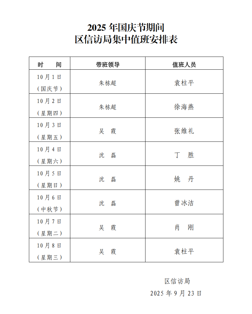 2025年國慶節期間區信訪局集中值班安排表
