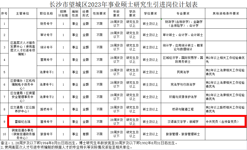 2023年8月31日,長沙市望城區發布招聘簡章,面向社會公開招聘事業單位工作人員49名、公開引進10名事業碩士研究生,其中,湖南雷鋒紀念館分別設置一個崗位——事業編財務、宣傳專干。