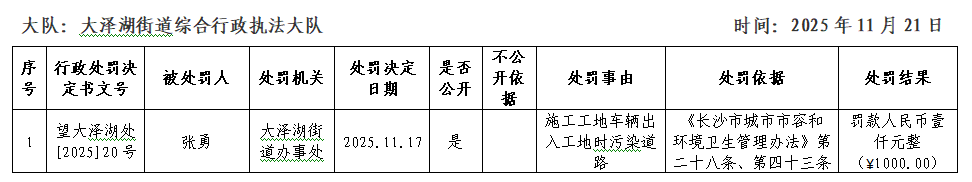 長沙市望城區大澤湖街道辦事處行政處罰決定信息公布表